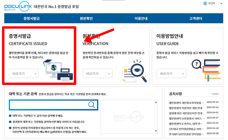 해당 홈페이지에 들어가셔서 위에 나온 증명서 발급에 들어가주시면됩니다.