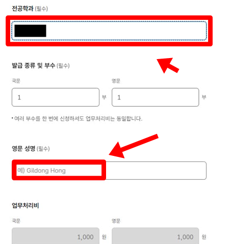 자신이 학교를 나온 전공 학과를 입력을 하시고 발급받으실 부수라던지 종류를 하나하나 선택을 해주시면 됩니다.